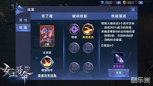其中主技能会在宠物1级的时候就激活,而被动技能只有宠物提升到相应的等级之后方能够逐一解锁。而在《女王号令》新版本的宠物技能系统当中,宠物的被动技能会在解锁之时随机获得,不过勇士们可以使用洗练药水,对宠物的被动技能进行替换,获得更高级的被动技能!