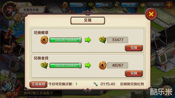 这时就需要看交易系统的啦。从玩家建立的任意一个市场之中点击交易按钮就可以进行兑换。玩家可以将粮草和金钱相互兑换,获取自己需求的资源。但需要各位玩家注意的是,兑换比例并不是恒定不变的,每过一段时间兑换比例都会刷新,所以想要进行资源兑换的玩家请抓好兑换的时机。