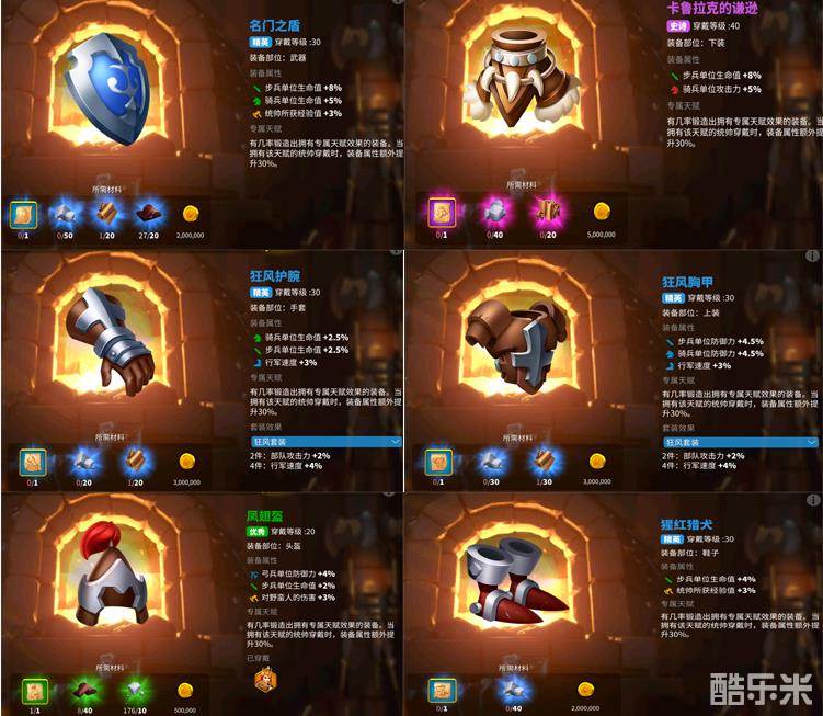 总属性(不计狂风套装加成):步兵防御:+4.5%步兵生命:+24.5%行军速度:+6%野蛮人击杀经验:+6%对野蛮人伤害:+3% 狂风两件套加成属性:部队攻击力:+2%(装备属性增幅以游戏内为准)