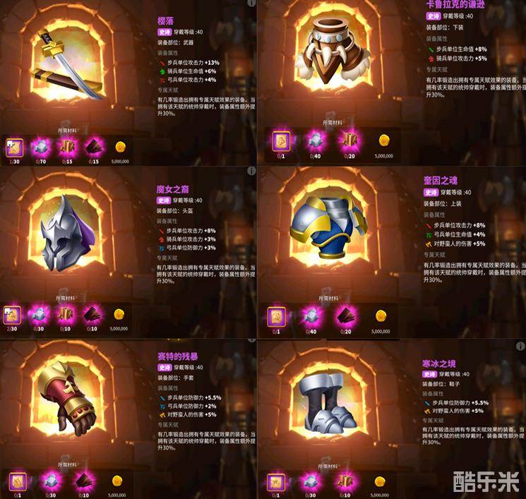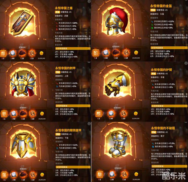 总属性(不计永恒帝国套装加成):步兵攻击力:+42%步兵防御力:26% 永恒套装加成属性:部队防御力:+3%行军速度:+10%步兵攻击力:+5%(装备属性增幅以游戏内为准) 神装提供的爆炸三围属性让每一个车头大佬都深深的爱上了它没有最强只有更强只要穿上它让敌军诠释刮痧的含义装备解析与制作优先级示例:虽然小编还没有金装但是梦想总要有的万一呢?在翻阅了大量资料后了解到金装作为RoK里最顶级的装备制作起来非常困难各位执政官是否选择困难症都并发了先做哪个部位都显得尤为重要