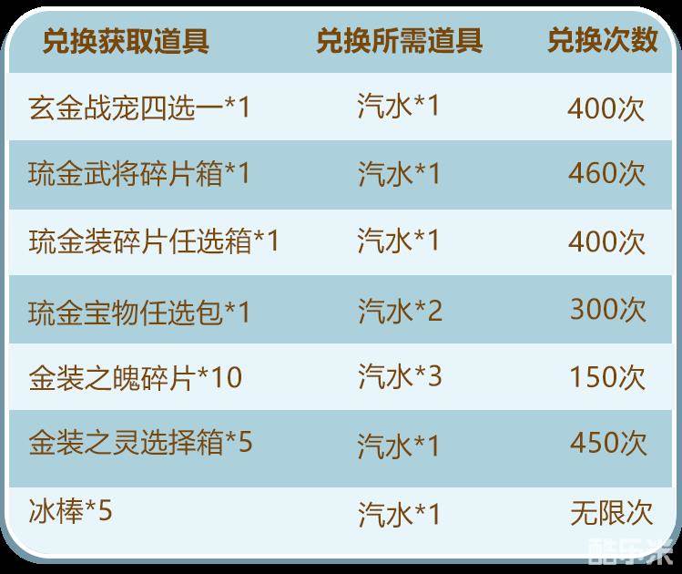 「汽水」可用来兑换玄金战宠四选一、琉金武将碎片箱等稀有资源: