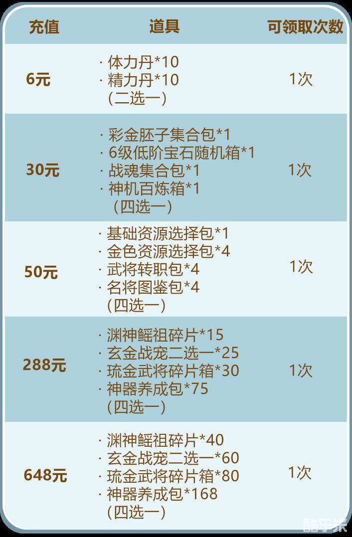 在活动期间少年们单笔充值至指定金额,即可获得玄金战宠四选一、琉金武将碎片箱、琉金装琉金宝碎片箱、神器养成包、汽水等资源: