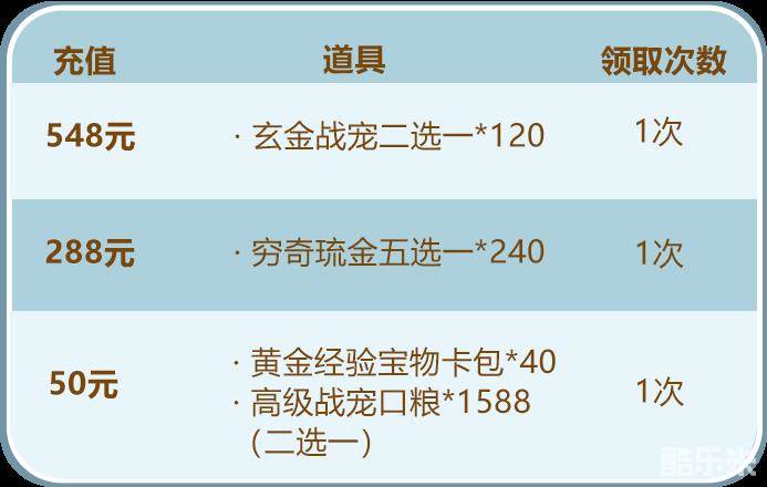 少年们单笔充值指定金额,即可得到玄金战宠二选一、穷奇琉金五选一等珍稀资源,少年们千万不要错过哟~