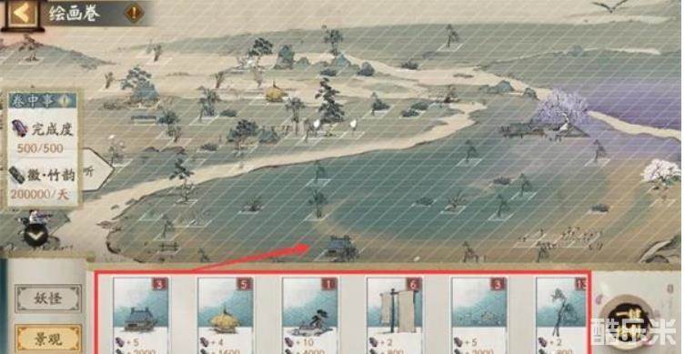 点击右下角绘画卷参与此玩法,将取材掉落的景观&妖怪摆放至画卷之上(可一键绘制自动摆放),类似于百景图摆放的玩法,达成完成度即可挑战boss、摆放的越多收益越大。其中妖怪道具需要驯服(爬塔)之后才会摆放,景观道具则可直接摆放。(这个摆放是会按照你自己DIY活动结束系统赠送插画,不想插画太过潦草可要好好设计摆放哦)