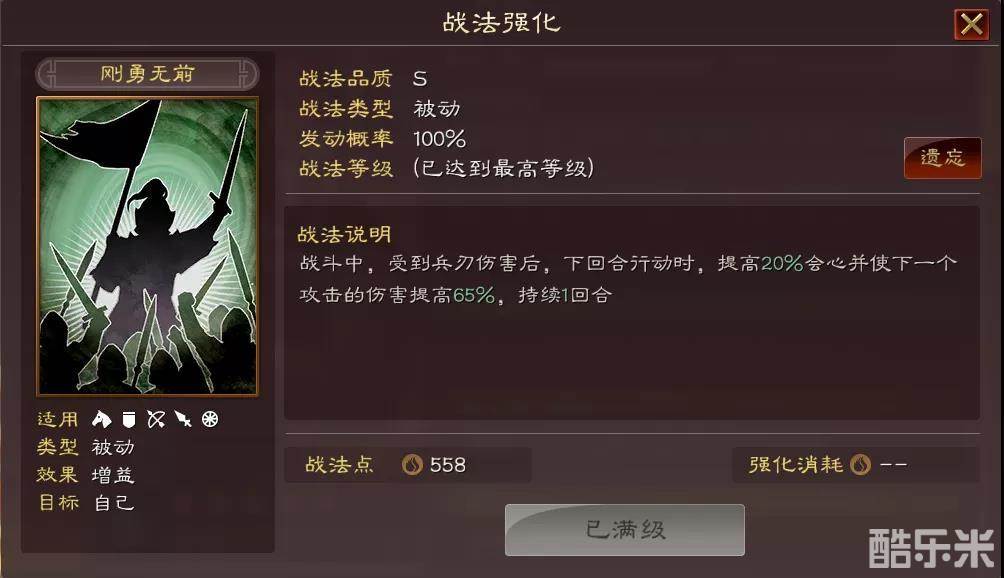 “刚勇无前”,几乎可以说就是为张飞量身定做的,没有武将比张飞更适合这个战法。只需要受到兵刃伤害就能触发,概率非常之高!“燕人咆哮”和“绝地反击”都是超高输出的AOE战法,张飞输出就固定在245回合,完美适配刚勇无前,输出炸裂!