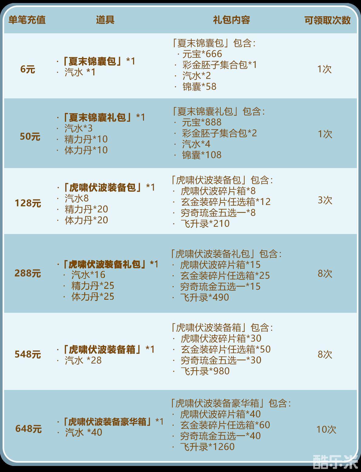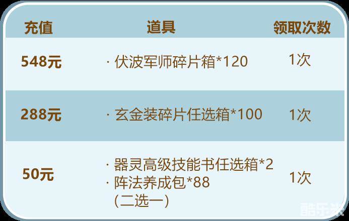 在活动期间少年们单笔充值至指定金额,即可获得虎啸伏波碎片箱、玄金装碎片任选箱、穷奇琉金五选一、飞升录、汽水等资源: