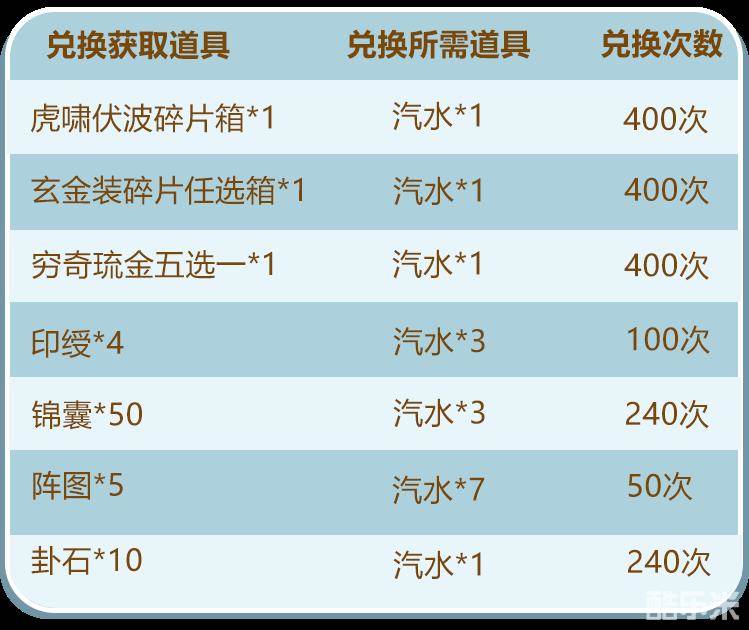「汽水」可用来兑换虎啸伏波碎片箱、玄金装碎片任选箱等稀有资源: