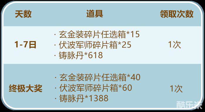 1-7日可领取:「玄金装碎片任选箱」*15 或 「伏波军师碎片箱」*25 或「铸脉丹」*618