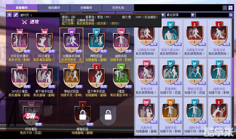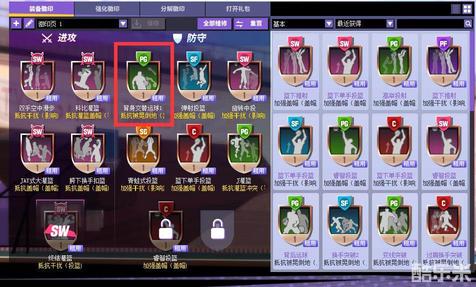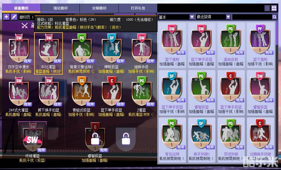 下图选中的徽印的意思为当SW进攻时使用科比灌篮技能时抵抗灌篮盖帽(被对手击飞概率)