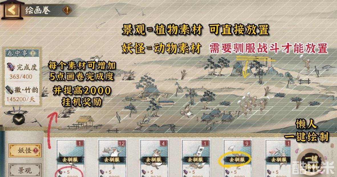 将【绘画素材】放入画卷中,增加完成度,提高放置收益。
