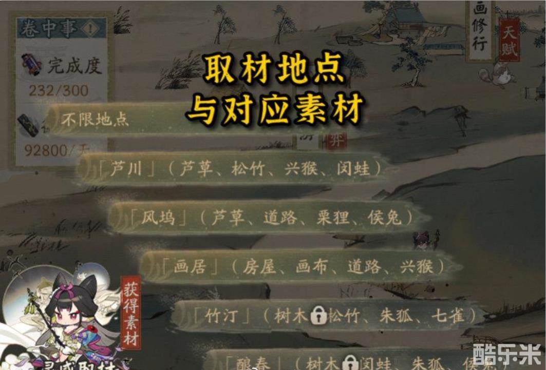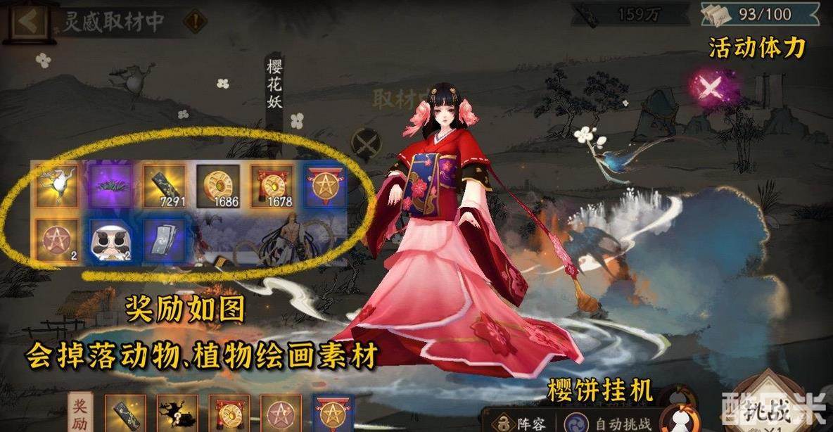 【灵感取材】:花鸟卷在地图上探索,战斗刷材料,获得【绘画素材】与货币。