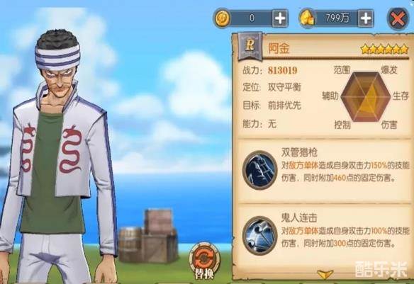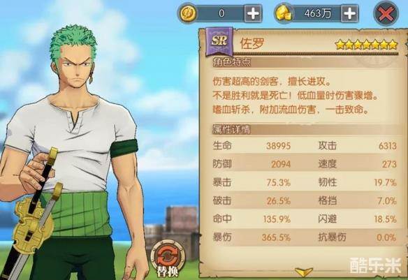 所以在全部给4件装备换上10级复仇宝石后,SR索隆的面板爆伤达到了365%,就是这个爆伤面板,造就了百万战力的SR,其提供的战力实在是令人看着喜欢。