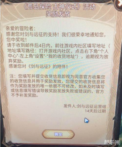请于收到邮件后4日内,前往游戏内社区填写地址。