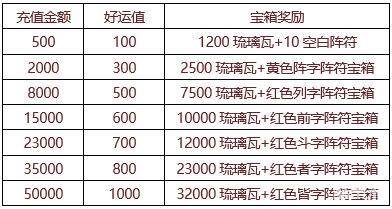 【活动内容】活动期间可通过充值金币获得好运值,积累好运值即可打开宝箱奖励,超多的琉璃瓦,大量的阵符宝箱,绝对超值的提升战力资源,尽在特惠好礼。