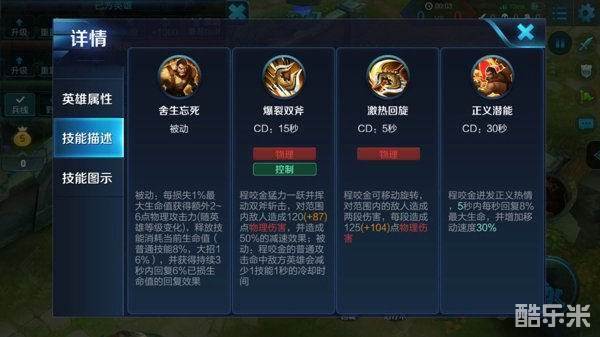 爆裂双斧:他的一技能是靠挥动双斧斩击并用力一跃,对范围内的敌人造成一定的物理伤害和减速效果。在参团的时候也可以很好的跳入敌人后方进行全队前后攻击取得不错的效果,另外,一技能可以穿墙,需要走位或者逃跑的时候可以发挥其关键作用。