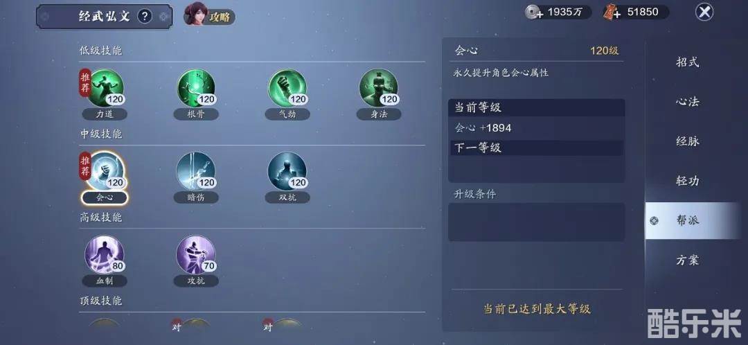 经武弘文:97级开放3个中级技能110~120的提升。总共需要45720帮贡和912W的碎银,提升446点功力。