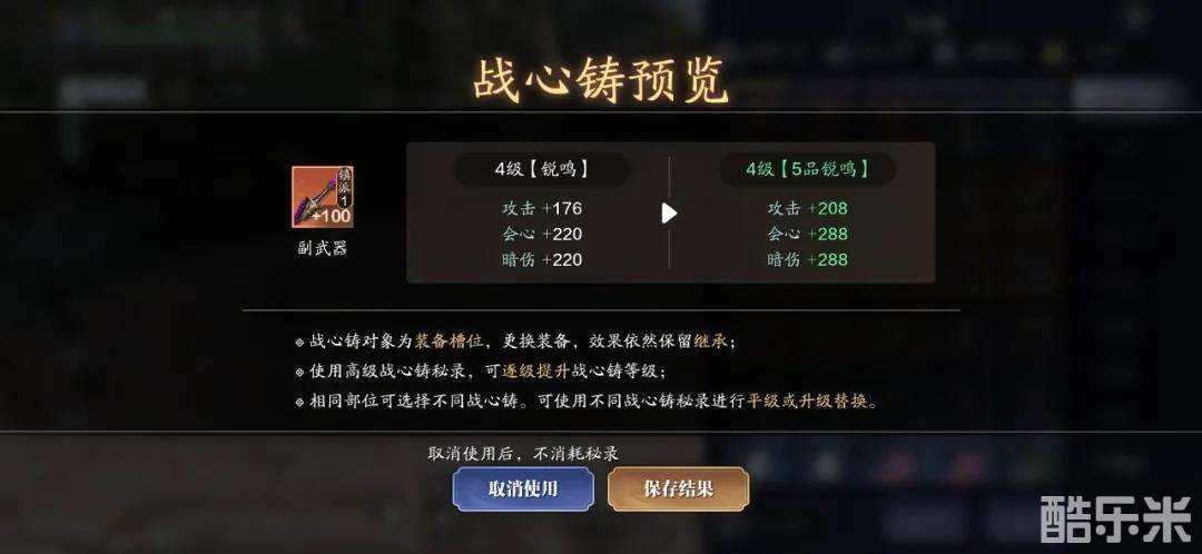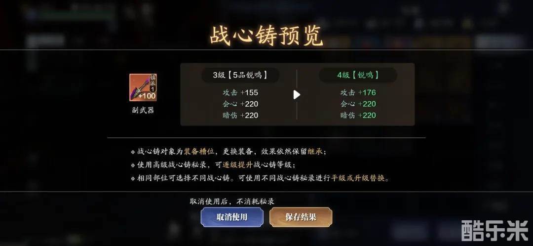 我运气不错当天爬地宫正好掉了副武器4级5品战心铸,在上面的基础上增加了173点功力。