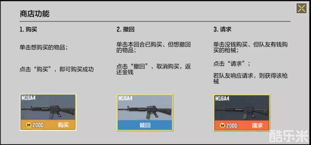 如果在此期间战士们M币不够,可以通过请求枪械的功能,得到队友的支援。此外战士若买错武器,也可以通过撤回功能取消购买,并收到返还的M币。