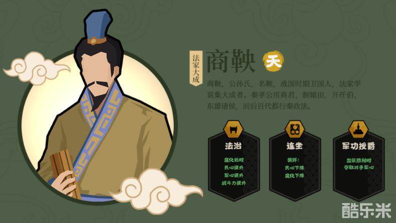 商鞅在《无悔入华夏》是归属于政治类的名臣,法治可以使腐败下降、民心以及军心上升,连坐同样有使腐败下降、民心上升的效果,不适合在国土内有城池的民心过低时推行。解锁了军功授爵技能后,还可以增加军队的战斗力,希望发展经济跟军事力量的国君,招揽商鞅是十分不错的选择哦