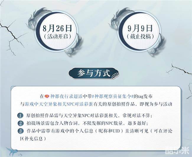 8月26日游戏版本更新之后至9月9日期间,降妖师大人们可通过与居民对话寻找线索,将与天空异象有关的对话截图或拍照,带#神都观察员征集令#话题发布在#神都夜行录超话#中,即可视为有效参与活动。