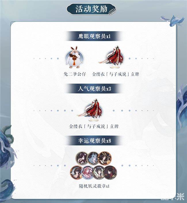 为回报观察员对神都界的贡献,活动结束后将评出“鹰眼观众员”一名,“人气观察员”三名,以及“幸运观察员”八名,分别赠予《神都夜行录》官方周边奖励。