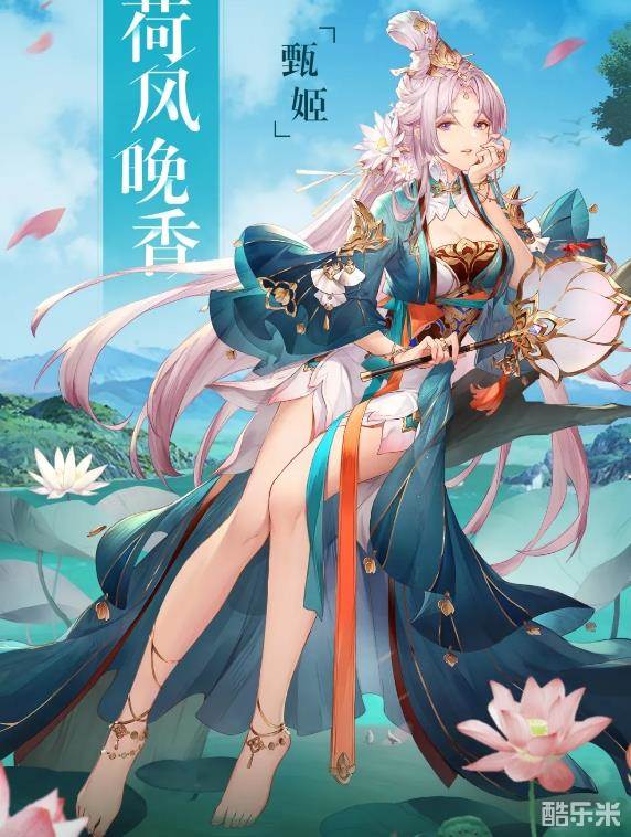 甄姬的罗裙与荷叶一般绿,袖口处层次分明,头饰与蒲扇也是荷花造型,再加上荷花花瓣一样的裙摆,整体如同荷花一般亭亭玉立,清新恬雅,明媚动人。