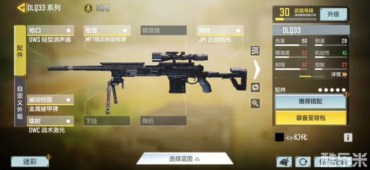 在使命召唤手游中dlq33可以搭配OWS轻型消声器、MFT狙击轻型枪管、JPI近战枪托等来提高dlq33的机动性和穿墙能力,今天小编给大家带来了《使命召唤手游》dlq33最强配件推荐,感兴趣的小伙伴一起来看看吧。