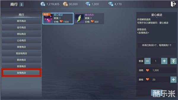 3、实际上,购买物品时建议玩家优先选择爱心痕迹和精力药水,前者售价1500友情点,作用是在角色行走时附加爱心特效,并提供0.5%的格挡属性;后者售价300友情点,是小伙伴们在挂机和副本时需要用到的,毕竟精力不足会造成经验获得效率的降低。