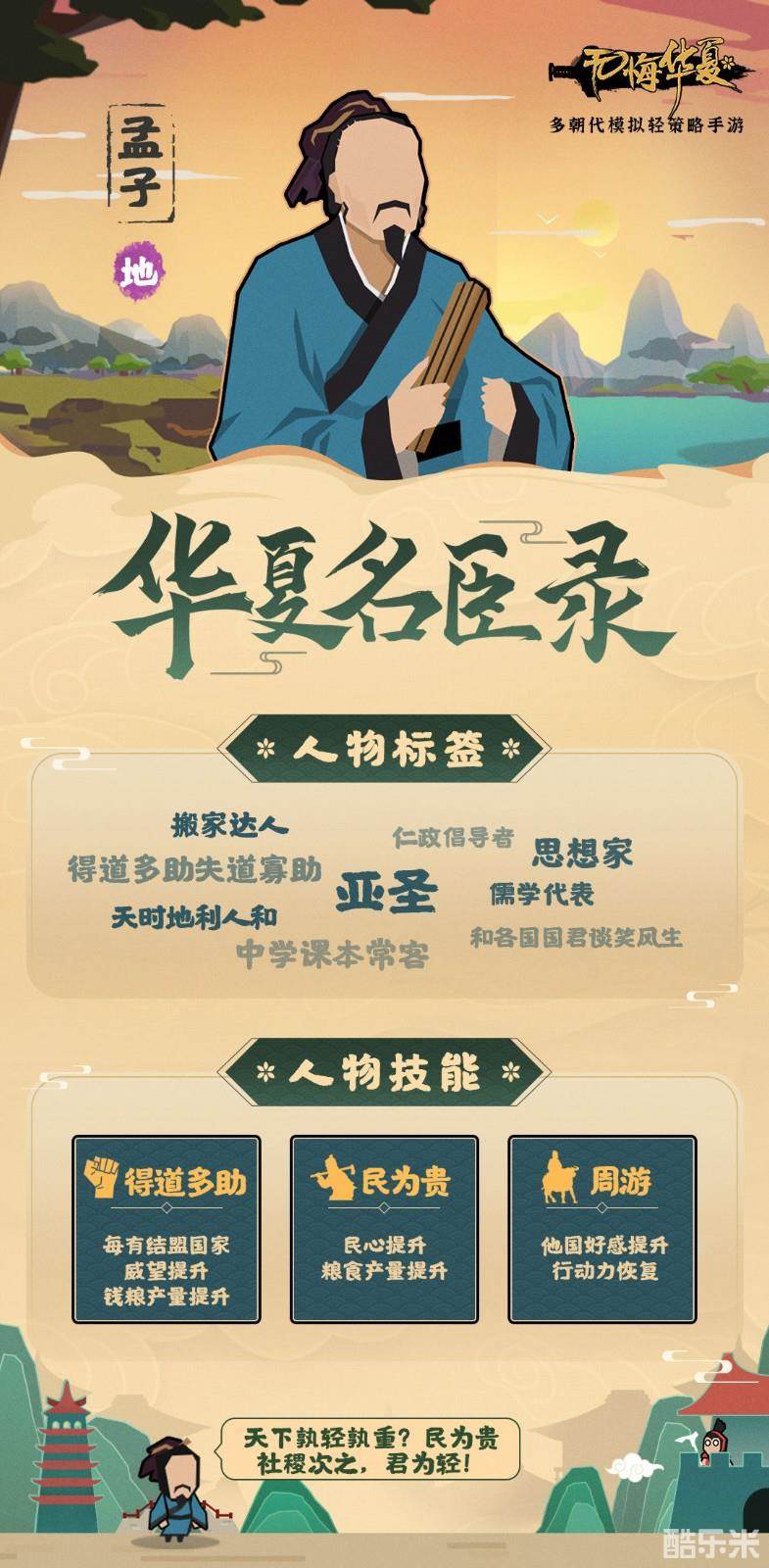 《无悔华夏》是一款多朝代历史题材的轻策略模拟经营手游。玩家将扮演所选势力的君主,携众名臣武将,通过制订不同的策略学习不同的政策来发展己方势力,在不断与多方势力的纵横中,最终一统天下。游戏中孟子怎么样呢?一起来看看《无悔华夏》华夏名臣录——孟子介绍吧!