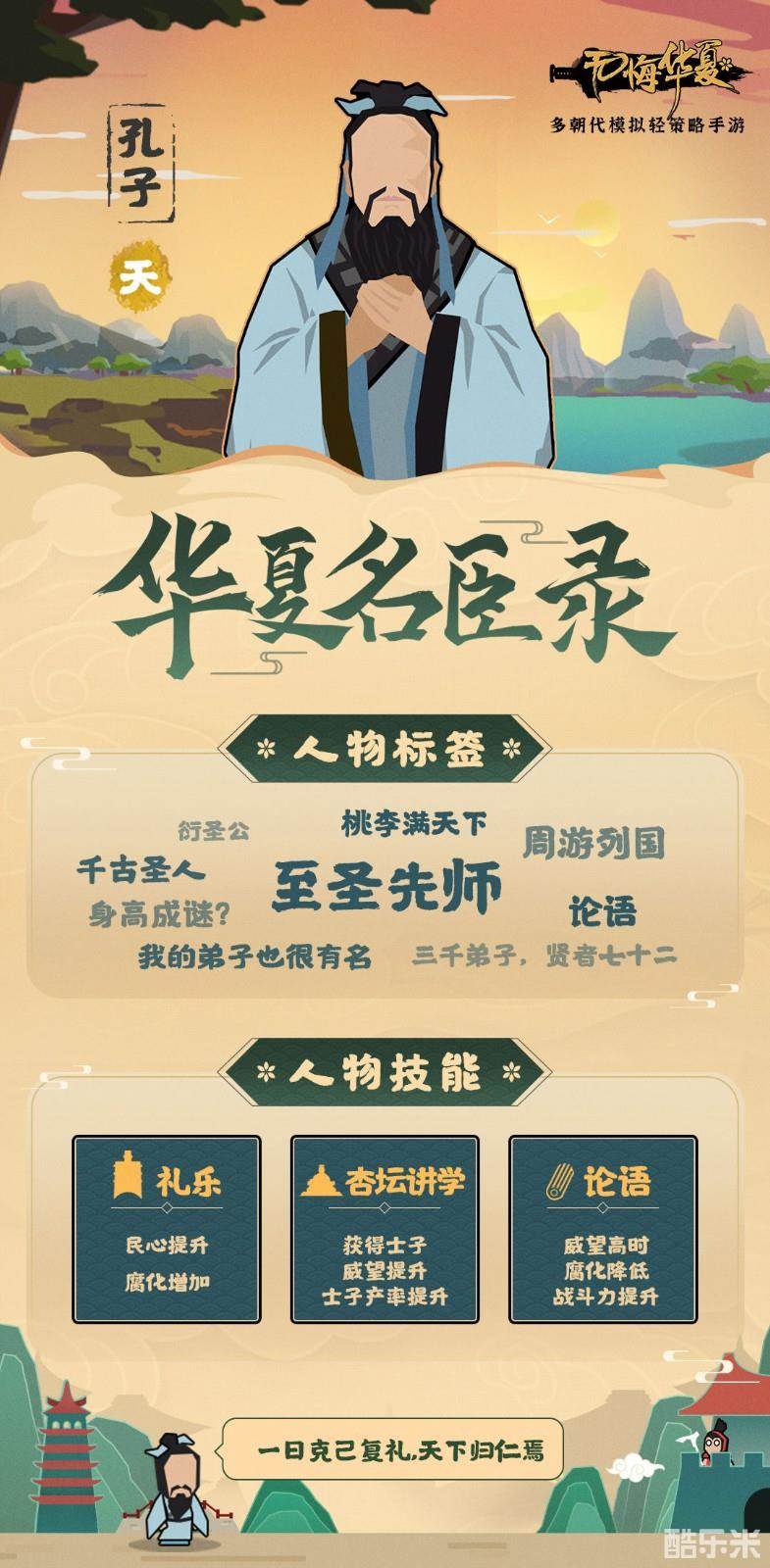 《无悔华夏》是一款多朝代历史题材的轻策略模拟经营手游。玩家将扮演所选势力的君主,携众名臣武将,通过制订不同的策略学习不同的政策来发展己方势力,在不断与多方势力的纵横中,最终一统天下。游戏中孔子怎么样呢?一起来看看《无悔华夏》华夏名臣录——孔子介绍吧!