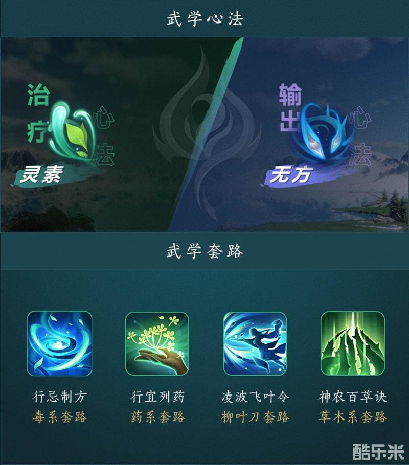 药系套路“行宜列药”:使用内力催动药草,巧妙利用药性搭配,远程治疗友方目标,是主要的治疗套路。