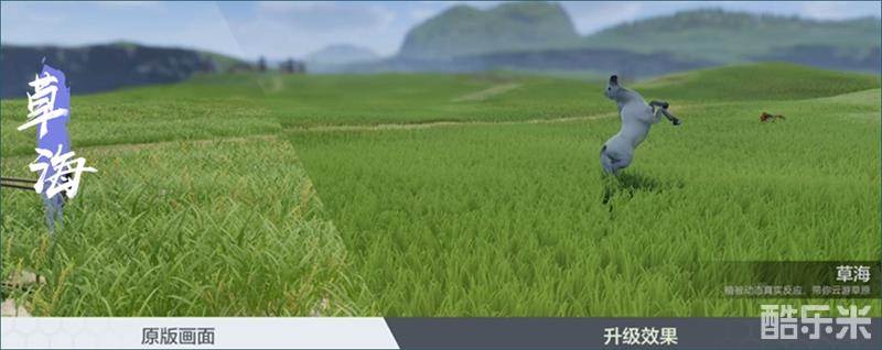 此外,草海的效果也得到了优化,植被效果升级,新增GPU的植被使密度更高,动态反应更真实,带给侠士云游草原新体验!最后,地形和场景物件模型的多边形会自动细分到几个像素宽,提供更加精致的渲染效果和质量。