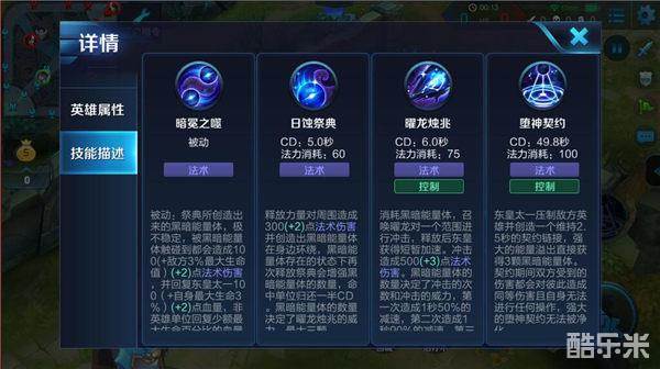 技能效果,东皇太一通过祭典释放出不属于这个世界的黑暗能量对周围范围内的敌人造成法术伤害,并且东皇太一会凝聚这些黑暗能量,制造出一颗黑暗能量体在身边漂浮,在有黑暗能量体的存在下,再次释放该技能会增加黑暗能量体的数量,并且在命中地方单位后会减少该技能一半的冷却时间,东皇太一最多可以拥有三颗黑暗能量体。这个技能是东皇太一的主要输出手段,配合上被动恢复效果,可以让东皇太一在团战中肆无忌惮的冲锋陷阵,对敌方全体造成高额的范围伤害,并且自身还能获得巨量的回复效果,打乱敌方阵容,为己方创造输出环境。