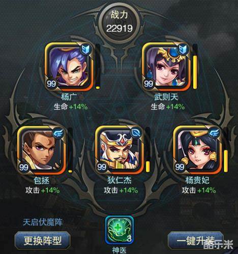 最简单暴力的思路。核心思想是在最快的时间结束战斗,不是你死就是我亡。这种阵容一般以1辅助+4攻击型为主。阵法以雷阵和地阵为主。例如康熙+苏小小+三个攻击型将领。康熙放2号位首先群体加能量,苏小小放到3号位,不指望开出必杀技,只求一个开场buff,靠4和5号位的必杀技最快速度解决战斗。