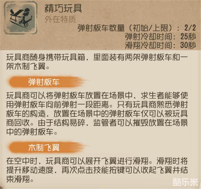 玩具商可以在开局放置弹射板车,如果被监管者追击可以使用弹射板车与监管者拉开距离,并滑翔转点至安全区域。如果队友在玩具商附近牵制监管者,可以提前放置弹射板车,便于队友进行转点使用。