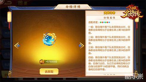 金色命格贪武守命-四级:除自身外每个队友受到攻击时,自身都会获得相当于自身生命上限3%的御甲值。自身行动后,为己方全体附加相当于自身当前御甲15%的御甲值,同时消耗自身相应的御甲值。