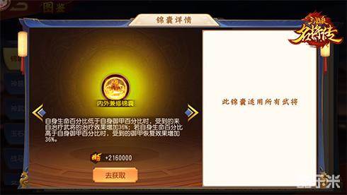 内外兼修锦囊:自身生命百分比低于自身御甲百分比时,受到的来自治疗武将的治疗效果增加36%;若自身生命百分比高于自身御甲百分比时,受到的御甲恢复效果增加36%。