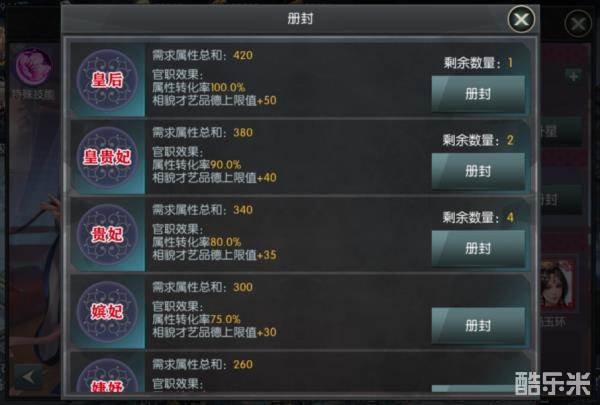 1.当红颜的三维属性总和满足条件,可以对红颜进行官职的册封,官职可以提升红颜的属性上限;
