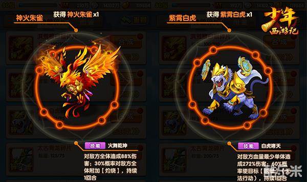 《少年西游记》此次推出的10只神兽均取材于中国神话,其中最为人熟知的当属4只橙色神兽: 太古青龙、紫霄白虎、神火朱雀、通天玄武。他们分别代表金、木、水、火四属性,永世守护着中华大地。此外,神兽在美术风格上完美融合了中国传统与西方魔幻元素,身披金甲、爪套锁链的上古神兽颇有西方魔幻中守城巨龙的霸气,从而带给玩家独特的视觉体验。