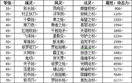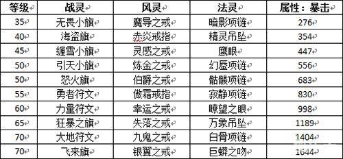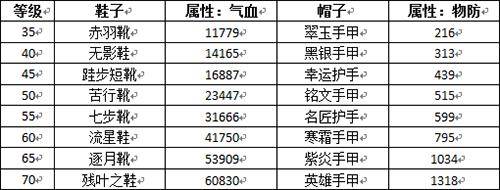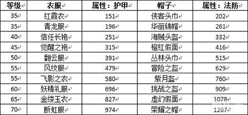 下面让我们来看看35-70级各种不同类型的装备属性表: