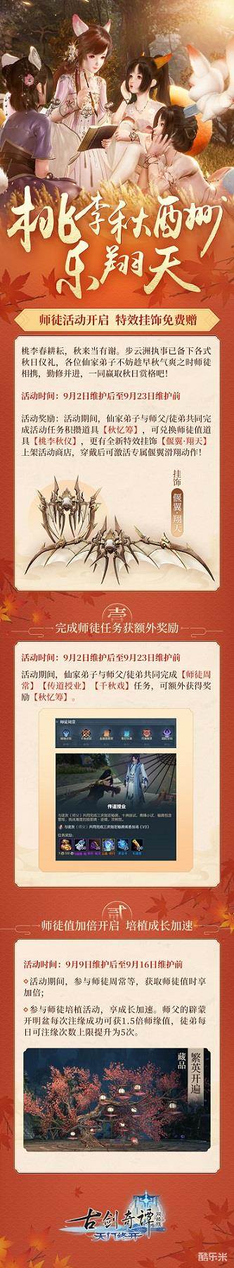 师徒活动“桃李秋酬”现已开放!本周更新维护后至9月23日,仙家弟子们登录游戏,与师父或徒友一起完成周常任务,传道授业,对局千秋戏等,即可额外获取“秋忆筹”,还有更多活动,让我们一起去看看吧!