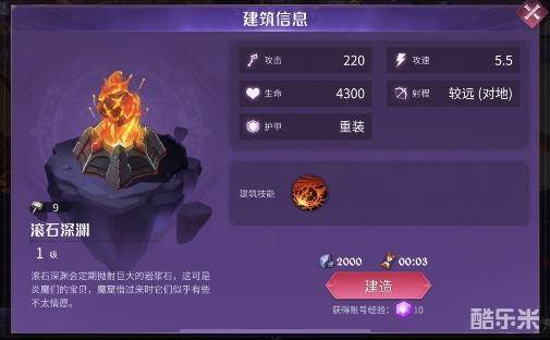 能够定期抛射巨大的岩浆石,大范围、远距离对敌军造成伤害,适合放在后排打成群结队的小怪,虽然要消耗九个建造点,但也是很值了。