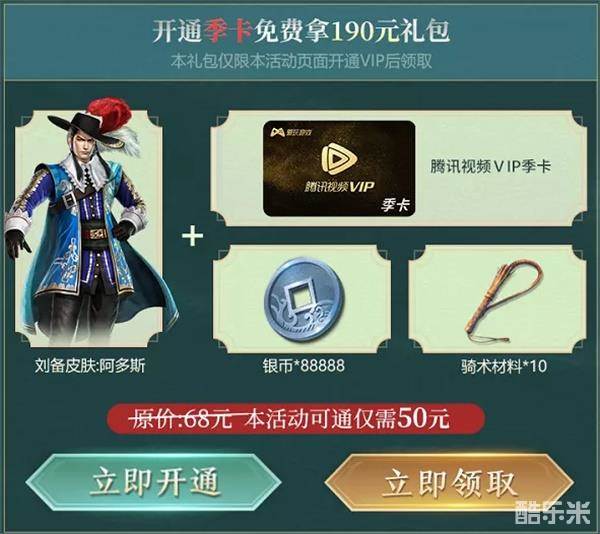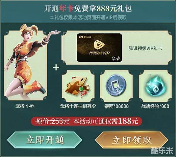 1、活动期间在指定页面新开通腾讯视频VIP,即可获得真三国无双霸手游专属礼包,套餐道具每个账号仅可获取一次,请使用游戏角色对应的QQ/微信账号开通。