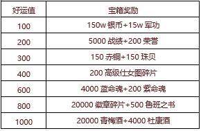 【活动内容】活动期间,每消费1000金币,即可获得100好运值,累计获得好运值可开启奖励宝箱。