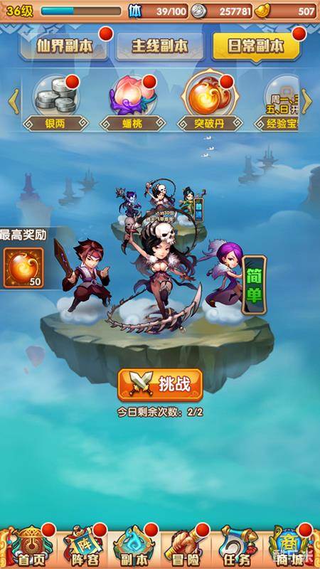 每天凌晨刷新日常副本,可以获得很多的资源,也是积累资源的主要方式,像突破丹什么的百分之七十是从日常副本出来的。而且日常副本难度很低,等级达到装备不全也能轻松通过。而这款游戏的副本也和其他的不同,这款游戏的日常副本是每天开启的都是不同,像今天开通突破丹副本,明天就开通其他副本。第一次挑战高难度的日常副本也会给一次额外的挑战机会,战力提升尽量打高级日常副本。