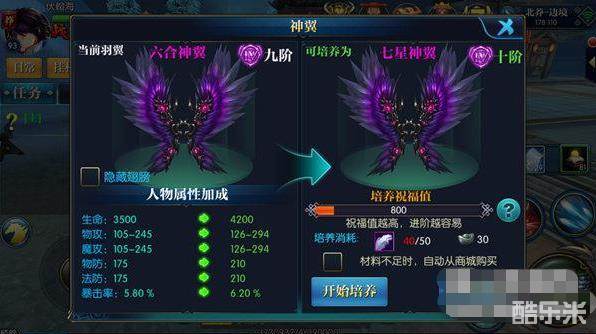 翅膀升阶需要消耗材料神羽,商城就有卖哦,并且价格相当便宜,只需要20银元宝就可以购买一个,购买了材料就可以进行进阶操作了,可以选择手动培养,也可以选择自动培养,要是材料不足,可以勾选自动购买选项。