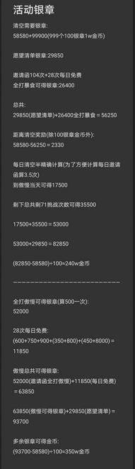 直接说结论,以上为半精确计算每日清空的银章数量,为了方便计算所以每日邀请函按3.5计算,实际是会多的