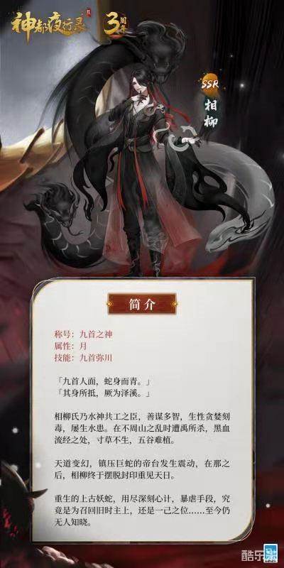 传说中,相柳本体蛇身而九首,皆为人面状态,不仅外型极其凶恶骇人,且身体蕴有剧毒。在被禹斩杀后,黑血洒落之处,至今寸草不生。上古时代,相柳氏向水神共工臣服,为其所用。相柳天生狡诈贪婪,但足智多谋,在两族相争时对人族多有残害,死后被镇压在帝台之下。然而天道变动神力崩溃,继共工重现人间后,相柳也从帝台封印中脱身,意图寻找共工再启战事……