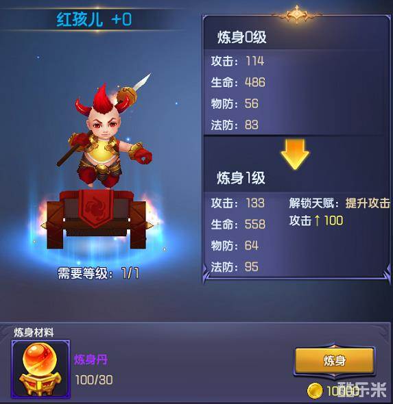 炼身是重生西游系统一个特色系统,当主角或英雄达到一定级别时,即可进行炼身。