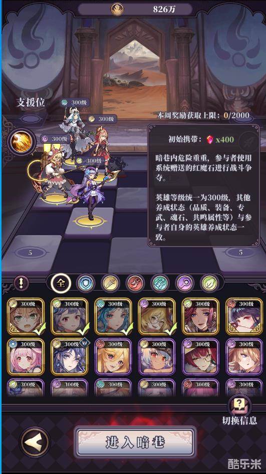 暗巷内所有参与者均使用同等级的英雄(300级)、其他养成状态(品质、专武、装备、魂石、共鸣属性)会与参与者自身的英雄养成状态一致,并影响战斗胜负。